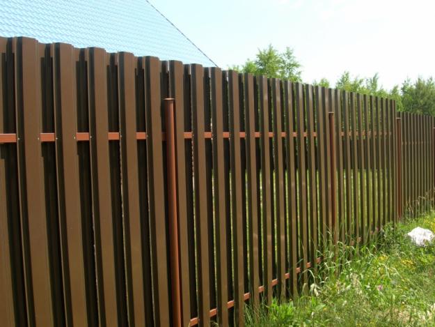 Переваги огорож з дерев'яного паркану і профнастилу об'єднав в собі металевий паркан. Він дешевий, легкий у транспортуванні і установці, а також досить міцний.