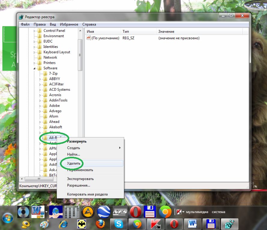 В данной ветке реестра вы увидите перечень всего программного обеспечения, установленного на вашем компьютере, а также и те программы, которые вы уже давно удалили. Чтобы убрать информацию о деинсталлированной программе, необходимо щелкнуть по ней правой кнопкой мыши и в открывшемся меню выбрать пункт удалить (см. рис.8).
