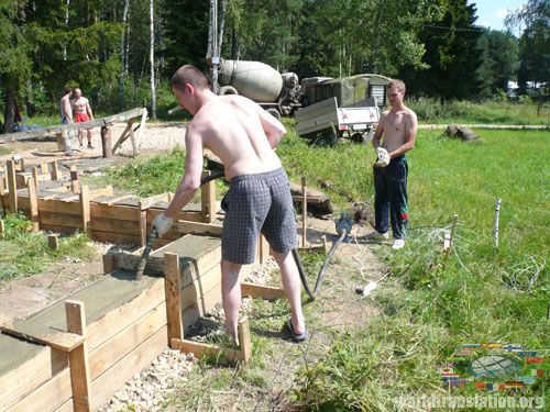 Это завершающий этап, который также имеет свои нюансы. Главное – соблюдать технологию приготовления раствора и его заливки, так как исправить что-то после застывания раствора будет довольно проблематично. Для заливки фундамента применяют готовые бетонные смеси (200м и 300м), но можно изготовить смесь и самостоятельно, что позволит вам сэкономить немалую сумму денег. Для этого необходимы лишь песок, цемент и вода. Основной характеристикой качественного раствора является его консистенция – однородная, без комков невымешанного песка и цемента. Он должен быть достаточно жидким, чтобы не образовывать пустот (при необходимости следует разбавить раствор водой). При заливке необходимо утрамбовывать раствор (вручную или с использованием механических или пневматических вибраторов), чтоб не возникали воздушные пузырьки в фундаменте, что плохо скажется на его прочности. Если уровень фундамента планируется поднять выше уровня земли, дополнительно следует установить опалубку (чаще всего для этого используются деревянные щиты). В этом случае бетон заливается вровень с ранее установленной опалубкой, после чего поверхность выравнивается мастерком. Твердение фундамента будит происходить на протяжении 2 – 3х недель. В жаркую погоду рекомендуется в первые дни периодически поливать фундамент водой.