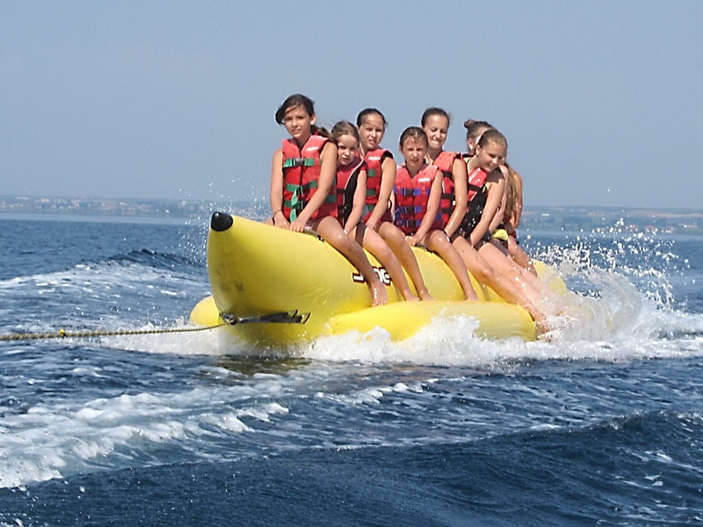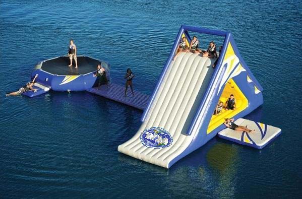 Водный батут очень популярный, на окруженном водой островке приятно попрыгать и одновременно искупаться. Надувные лодки используются в бассейнах и открытых водоемах, они очень легко устанавливаются и собираются. Надувные водные качели практичны на воде, реке, бассейне. Катапульты очень любят дети, по нему можно спускаться в воду или вылететь с катапульты. Пирамида - водный плавающий аттракцион, в виде шестигранной пирамиды, для спуска с горки. Водный банан - один из наиболее популярных видов отдыха на воде. Он представляет собой надувной шар в форме банана, движущийся с большой скоростью по воде.