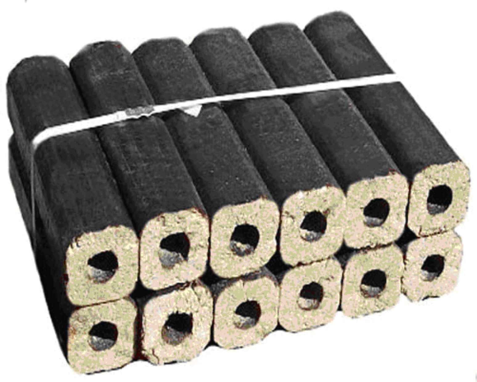 - Топливные брикеты Pini&Kay - наиболее качественный тип брикет, который имеет максимальную длительность горения и теплоту сгорания. Имеет форму шестиугольника (или неправильного многоугольного), с отверстием посредине. Изготовляется такой тип брикет путем действия высокого давления и высокой температуры. Теплотворность от 4500 ккалкг.