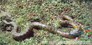 Знаменитая, всеми известная анаконда. Она достигает 12-метров длиной, а массой в две сотни! Анаконда – невероятно сильная змея. Ее сила способна заворожить любого. В рацион питания твари входят и крокодилы и черепахи.