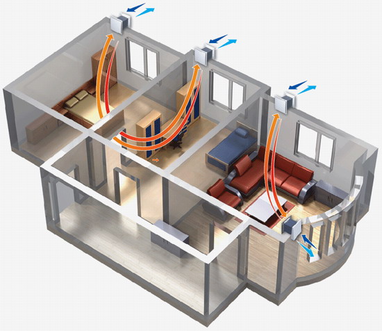 Якщо ж ви більш трепетно ??ставитеся до мікроклімату навколо вас, віддайте перевагу приточно-витяжній вентиляційній системі. Принцип її роботи полягає в тому, що повітря надходить в квартиру очищеним і свіжим, а забруднене автоматично видаляється. Така система відмінно розділяє повітря з кімнат і туалету з ванною. Свіже повітря надходить в квартиру постійно, так як система дуже надійна. Звичайно ж вентиляція в квартирі не може бути без недоліків. Вони починаються ще з моменту прокладання повітропроводів, так як їх необхідно класти під стелею. Крім того, для цієї системи вентиляції потрібен простір, щоб розмістити все обладнання. Шумоізоляція і вартість такої системи також залишають бажати кращого.