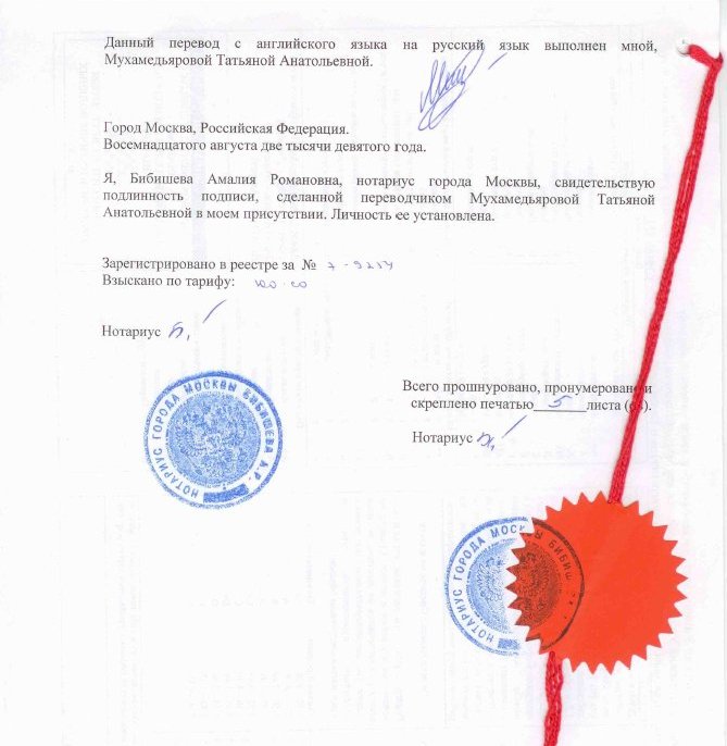 Бывает и такое, что сторона, которая принимает перевод документа, просит продублировать текст нотариального засвидетельствования непосредственно на языке перевода. В данном случае подпись нотариуса дублируется немного ниже оригинального текста засвидетельствования, переводчик, в свою очередь, ставит еще 1-ну подпись, ну а нотариус - вносит 2-ой раз в реестр факт осуществления еще 1-го перевода. При всем этом за 2-ое нотариальное заверение перевода взымается дополнительная плата. Нотариальный перевод сделанный данным образом, зачастую, требуют слудующие государства: РФ, США, Великобритания, Германия.