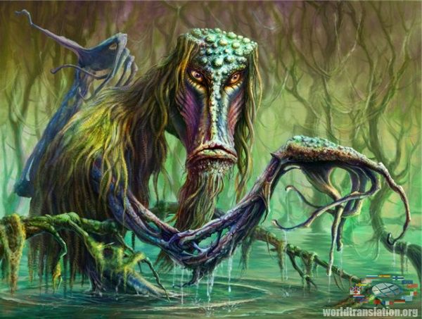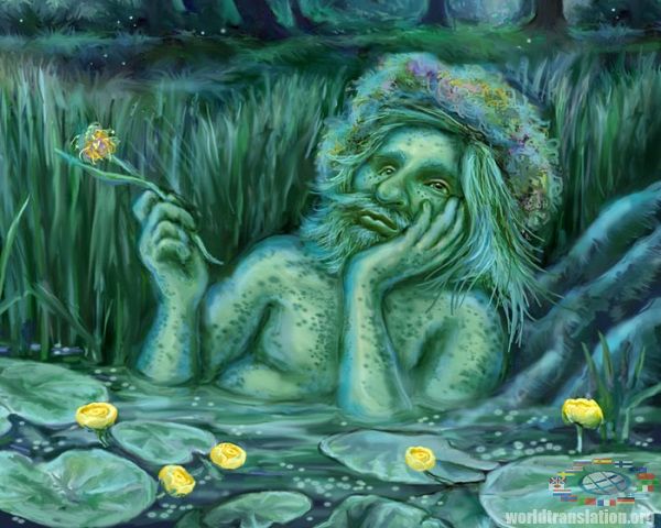 но, в отличие от него, не покрытого шерстью, и не такого назойливого. Леший и водяной любят браниться между собой. Также говорилось, что водяной лохмат и покрыт белой шерстью, и царствует в воде так же, как и леший в лесу. В рассказах его изображали, как безобразного голого старика, покрытого тиной, с длинной бородой и зелеными волосами. В Вологодской губернии крестьяне были уверены, что водяной – это широкоплечий мужчина с тонкими ногами. У него есть небольшие рога, хвост, на теле – чешуя, на ногах и руках – очень длинные пальцы с кривыми ногтями, а между пальцами имеются перепонки.
