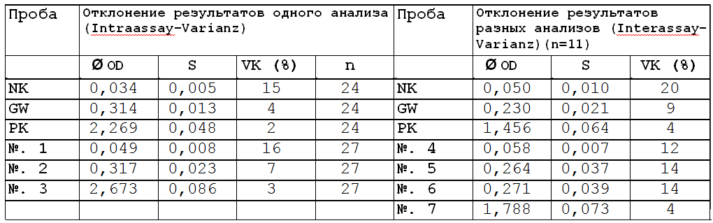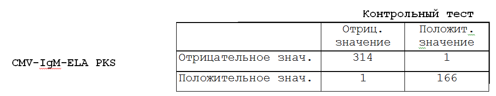 В процессе диагностической опытной проверки с помощью теста CMV-IgM-ELA PKS medac были исследованы 482 пробы сывороток, полученных от доноров и пациентов. Результаты были сопоставлены с результатами высокоспецифичного контрольного теста ELISA, проведенного в лабораторных условиях. Результаты представлены ниже в таблице с 4 колонками.