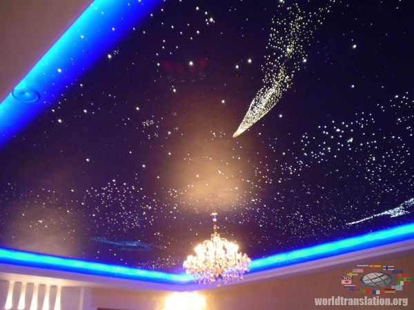 Сложный и дорогой способ, при котором световолокно выводится на плоскость пленки и его оснащают рассеивающим кристаллом. При этом для каждого рассеивателя настраивается своя специальная стойка, а пленка, в свою очередь, укрепляетсяв определенным образом в местах вывода точечного светильника. Благодаря всему этому на потолке формируют замечательные созвездие и получают неповторимый световой рисунок. А если стены комнаты покрыты декоративной штукатуркой типа венецианки, то лучи "звезд" будут играть на отделке стен.