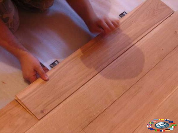 Переходим непосредственно к укладке. Формируем первый ряд, соединяя две доски. Обязательно делаем зазор между панелями и стеной при помощи распорных клиньев. Это нужно для того, чтобы стена не мешала естественному сужению и расширению ламината при перепадах температуры. Укладываем ламинат замком «на себя» для облегчения последующей работы.