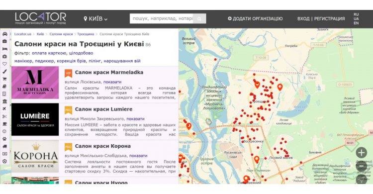 Довольно часто бывает так, что нам срочно нужно найти какую-то организацию, к примеру, салоны красоты Троещина, но мы даже не знаем с чего начать. Аналогичная ситуация наблюдается когда человек первый раз попал в новый для него город, ему очень трудно найти необходимые заведения или же предприятия. Благодаря интернету и телефону эти проблемы можно легко решить. Сервис Locator.ua поможет очень быстро найти необходимую информацию.