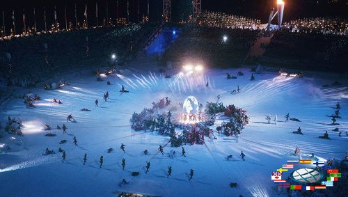 І знову біжать вогнями розцвічено стадіон. Ілля Авербух поставив барвисту льодову композицію: ковзанярі рухаються по п'яти концентричних колах. А в небі електрони рухаються по своїх еліптичнихорбітах. У зорових рядах виникають то тут, то там яскраві світлові фігури, символи основних видів спорту.