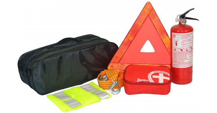 - Комплектація. Важливо, щоб набір включав всі необхідні елементи: аптечку, знак аварійної зупинки, вогнегасник тощо.